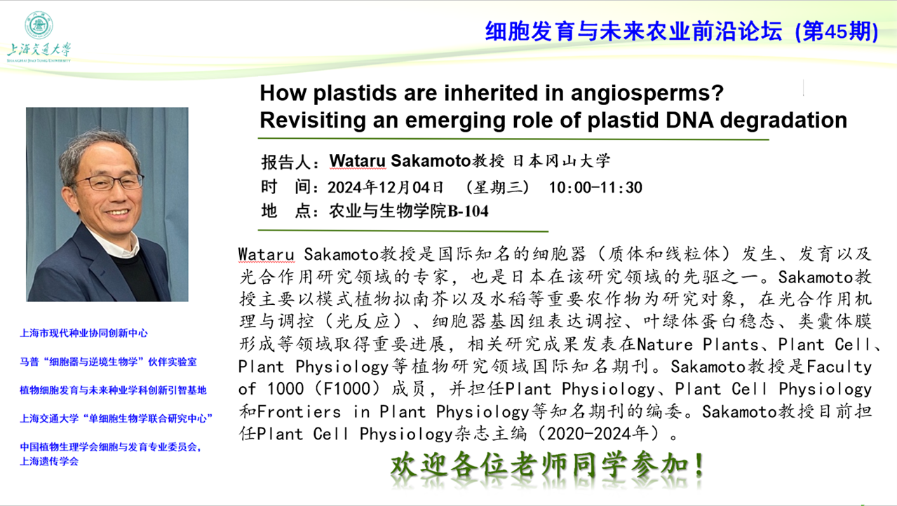 【细胞发育与未来农业前沿论坛第45期】How plastids are inherited in angiosperms?Revisiting an emerging role of plastid DNA degradation