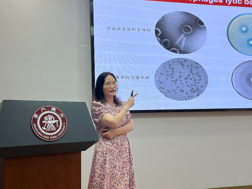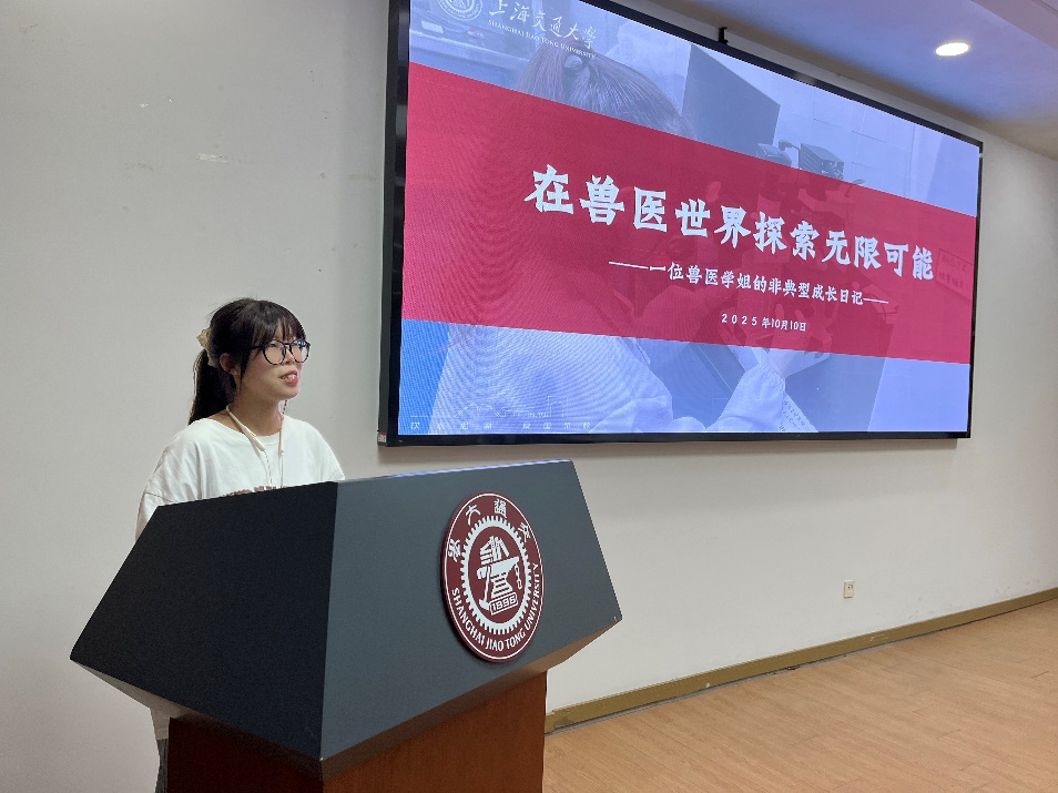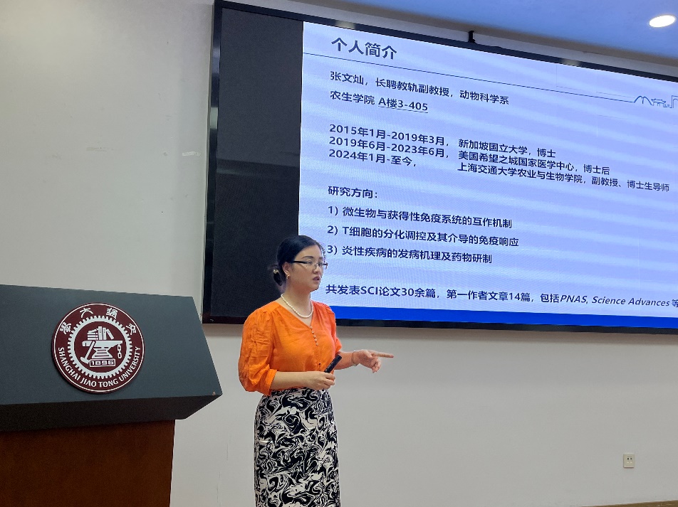 随后,袁聪俐以“宠物与宠物医药”为题,介绍了宠物和宠物医药产业的背景、现实需求和未来的发展方向,明确了动物科学专业人才在药物研发、疾病防控、成果转化方面的优势和前景。张文灿以“微生物与获得性免疫互作”为题,由浅入深地带领大家了解了免疫及免疫疾病相关知识,以及微生物语获得性免疫互作方面的前沿技术,介绍了自己课题组在T细胞相关领域的研究进展。严亚贤老师以“噬菌体——未来生物防控中的明星分子”为题,介绍了噬菌体在生物防控细菌性疾病发面发挥的重要作用和广阔应用前景。刘秋菊以“在兽医世界探索无限可能”为题,分享了自己从对兽医学一无所知,到喜欢上兽医学,并且做出出色成绩的亲身经历,她鼓励同学们积极参与科研项目,提前规划大学生活,培养自主学习和解决问题的能力,引导大家爱上动物科学专业。