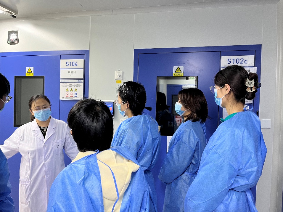 最后,暴肖丽老师带同学们参观了BSL-2生物安全实验室。暴老师介绍了实验室的组成并强调了注意事项,穿上防护服,让大一新生近距离感受了动科系的科研环境和科研方向。