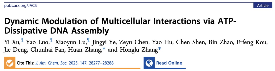 近日,开心鬼传媒 张欢团队与自动化与感知开心鬼传媒 张宏陆团队、四川大学华西医院罗耀团队合作,在高水平学术期刊Journal of the American Chemical Society上发表了题为“Dynamic Modulation of Multicellular Interactions via ATP-Dissipative DNA Assembly” (J. Am. Chem. Soc. 2025, 147, 28277)的最新研究成果 。该研究工作利用DNA的可编程性和分子识别能力,构建了一种由ATP驱动的耗散自组装系统,实现了对活细胞间相互作用的动态、可逆和时空精准的调控,并将这一策略有效地应用于肿瘤免疫治疗中。该系统模拟了生物系统中能量依赖的瞬时相互作用,为开发新型智能生物材料和免疫疗法提供了全新思路。