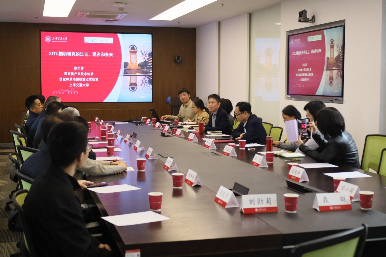 张才喜教授以“SJTU樱桃研究的过去、现在和未来”展开介绍,汇报了团队近年来的最新研究和生产进展。团队瞄准我国甜樱桃早熟栽培对优质早熟品种和栽培技术的迫切需求,围绕低需冷量、畸形果率低和丰产稳产性好等关键性状开展了系统性研究,选育出黄色早熟的“交萌2号”、需冷量低于200小时的“通萌1号”、适宜观光采摘的“早晶6号”等甜樱桃新品种,结合避雨栽培建立了丰产稳产的配套技术体系。针对未来樱桃发展提出了规划,将樱桃研究与AI等新技术相结合,综合各方力量对樱桃的育种、栽培、保鲜贮藏、高附加值利用等开展研究。随后,双方围绕樱桃发展及AI赋能等开展了热烈讨论和深入交流。