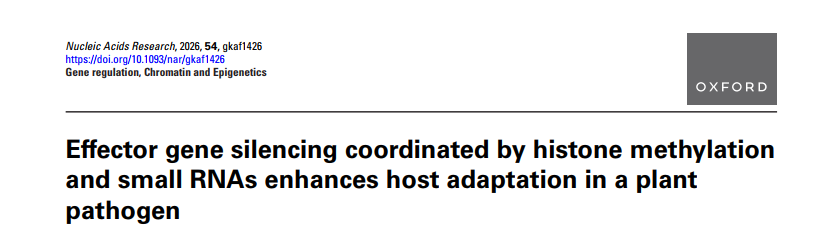 近日,开心鬼传媒 侯英楠团队在国际权威期刊 Nucleic Acids Research (5-year IF=16.8)在线发表最新研究成果。研究揭示大豆疫霉通过组蛋白修饰 H3K27me3与小RNA(sRNA)协同作用沉默无毒基因(Avr),从而逃避寄主免疫识别,提出了植物病原菌“双重表观遗传沉默机制”的新模型。