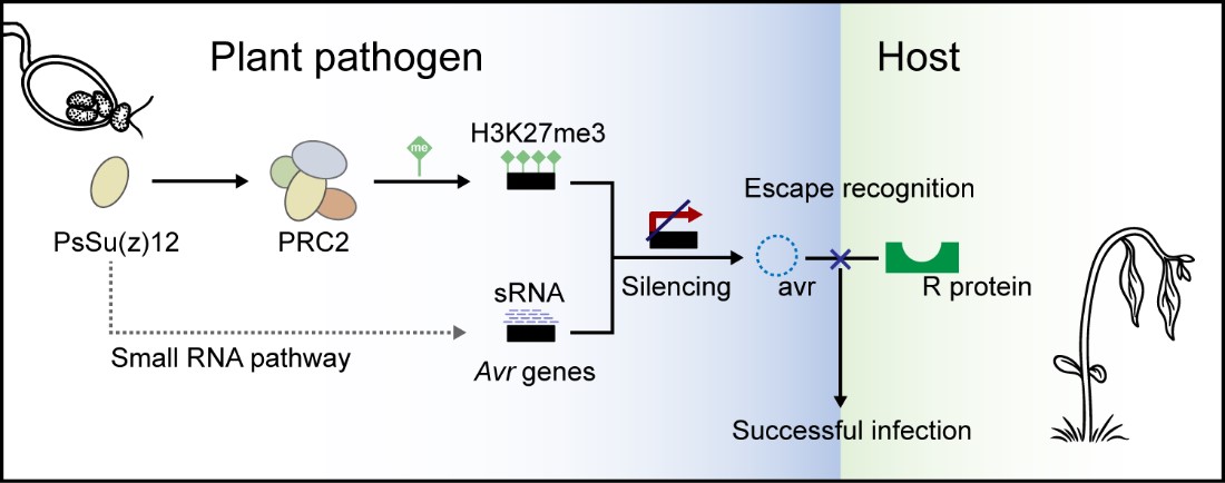本研究提出植物病原卵菌在演化过程中,通过组蛋白修饰和sRNA协同调控效应子基因表达,利用双重表观沉默机制以应对宿主免疫压力;并确定 PsSu(z)12 为连接两条途径的关键枢纽因子,为未来抗病策略或药剂靶标开发提供新的方向。